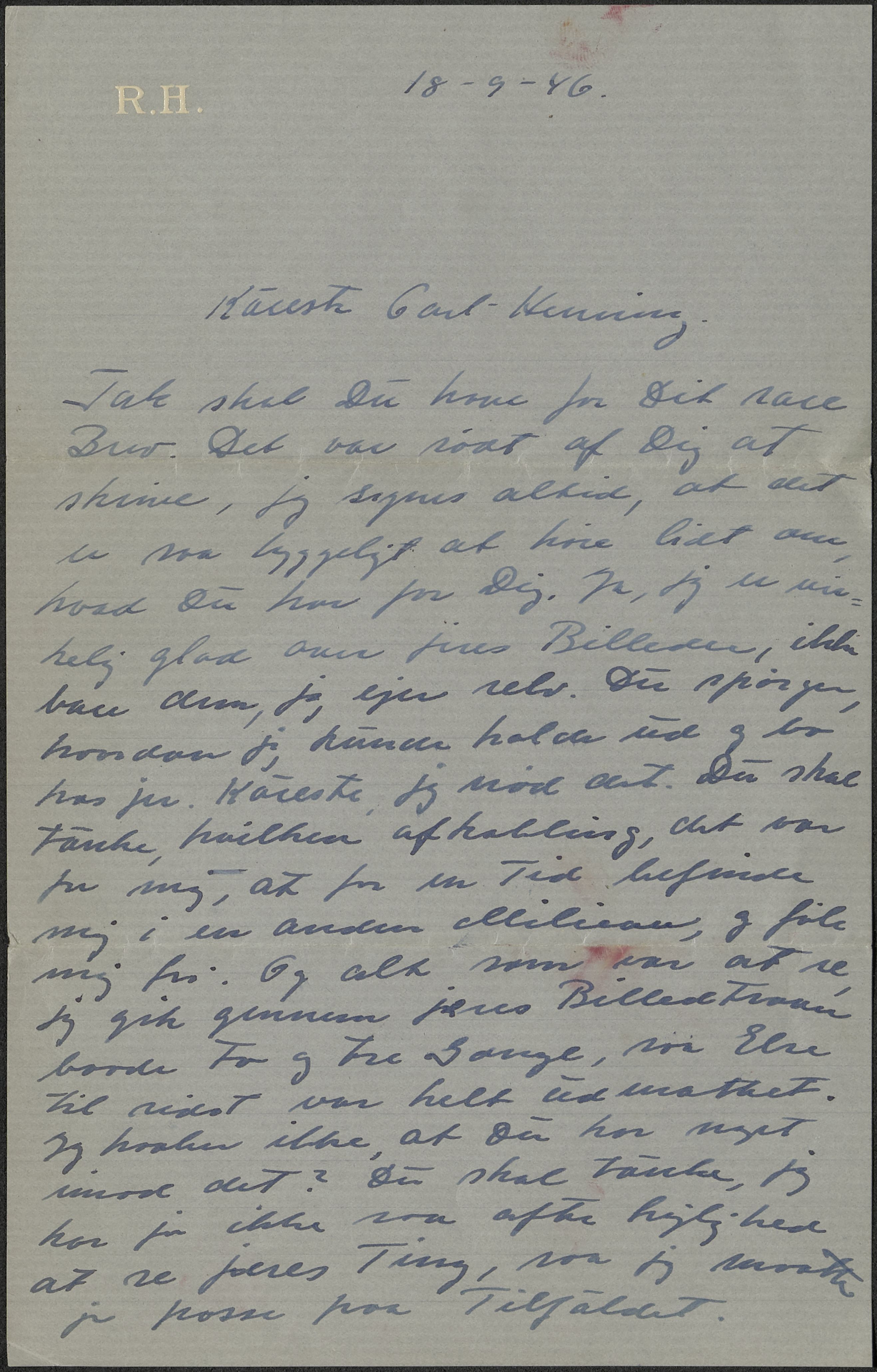 Rikke takker Carl-Henning for hans brev og fortæller, hvor meget hun nød at bo hos ham og Else — det var for hende en kærkommen afkobling og inspiration at se deres billeder. Hun ønsker ham tillykke med fødselsdagen og håber, han har modtaget pakken, som Else hjalp med at arrangere. Rikke nævner dårligt vejr, sine seneste gæster (bl.a. Gutte og Horn), og sin længsel efter Danmark, frihed og selvstændighed. Hun håber at kunne rejse til Høstudstillingen og fortæller, at hun har betalt for medlemskab gennem Else. Hun udtrykker spænding over Carl-Hennings nye værker, nævner kunstnerkredsen (Morten, Asger m.fl.) og afslutter med venlige hilsner til ham og børnene.