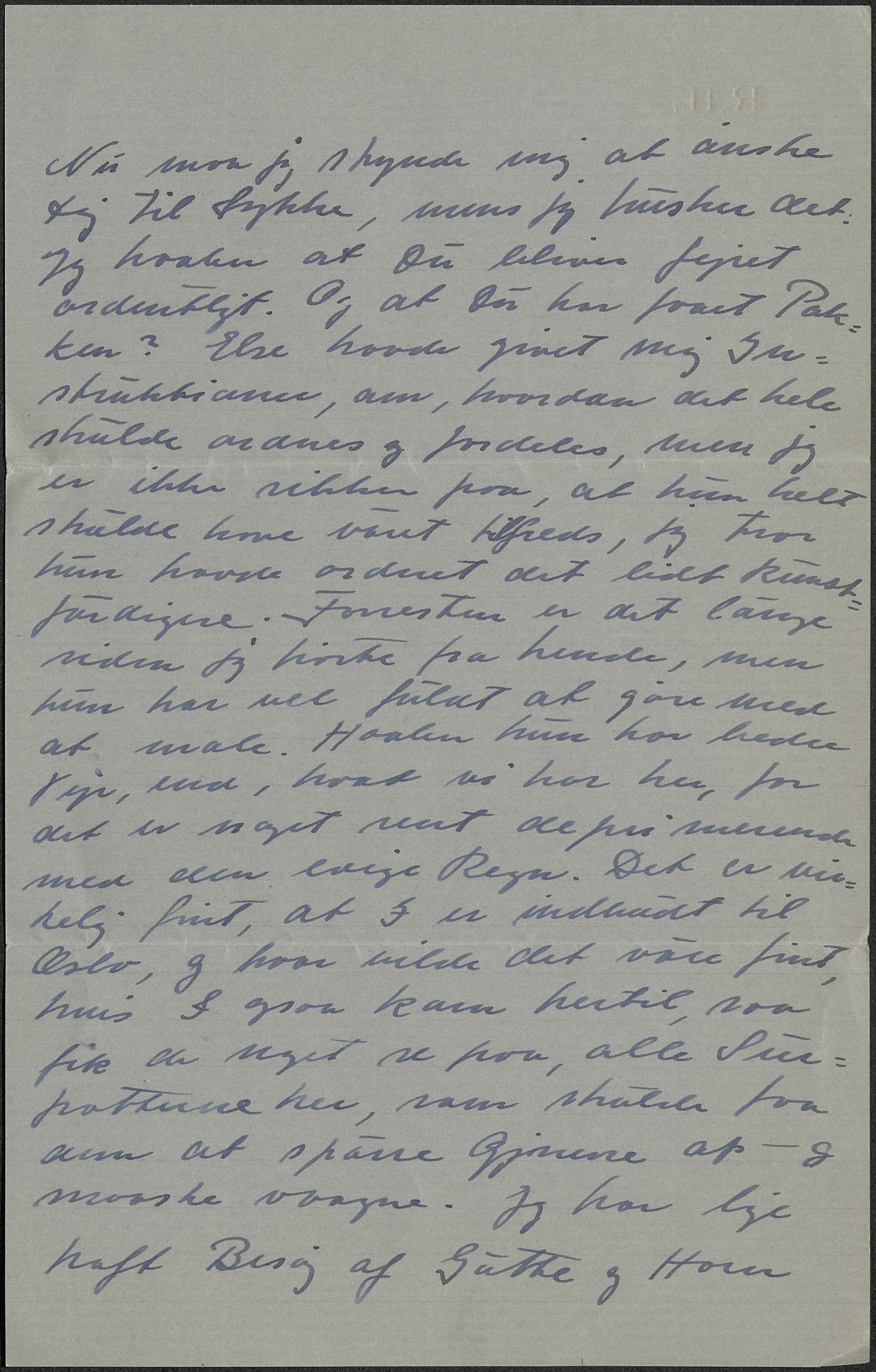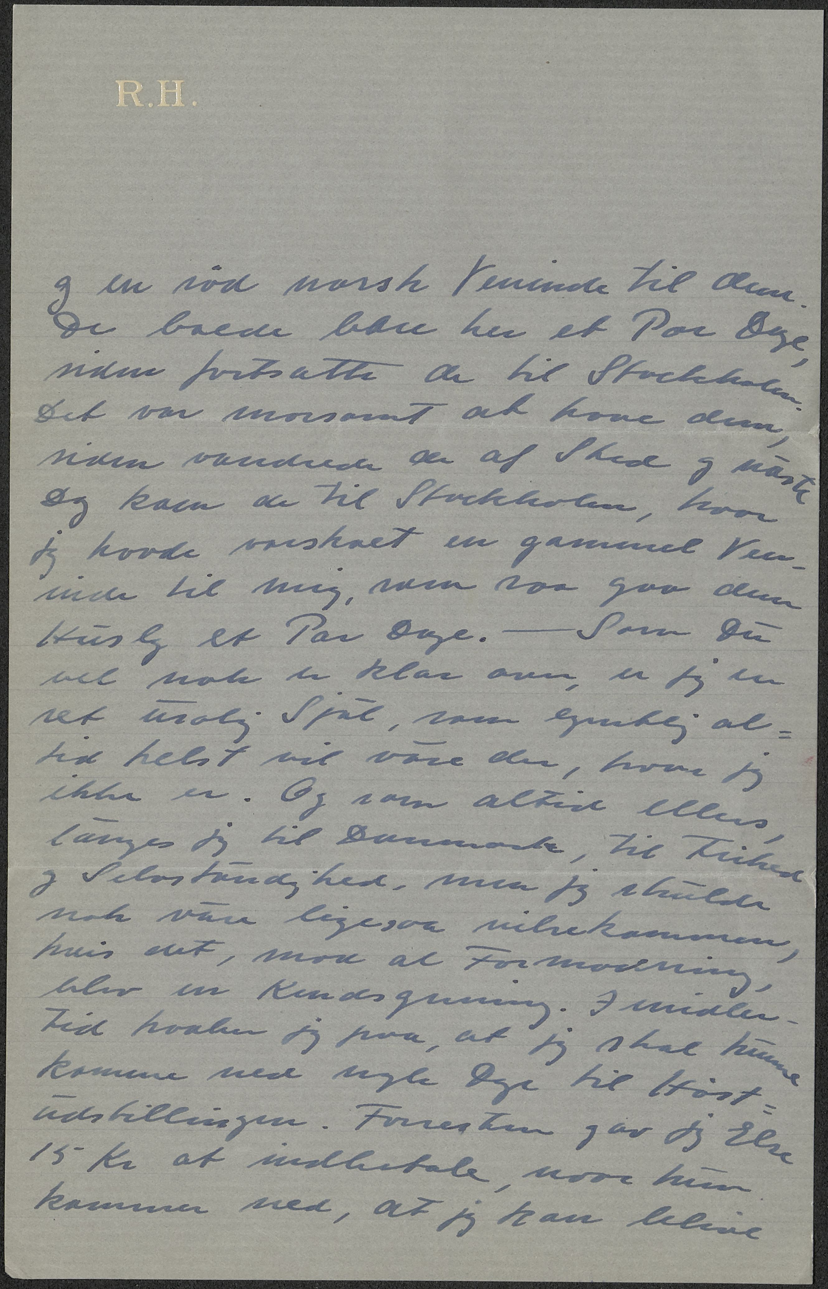Nu maa jeg skynde mig at önske dig til Lykke, mens jeg husker det. Jeg haber at du bliver fejret or-dentligt. Og at Du har faaet Pakken? Else havde givet mig Instruktionen, om, hvordan det hele skulde ordnes og fordeles, men jeg er ikke sikker paa, at hun helt skulde have väret tilfreds, jeg tror hun havde ordnet det lidt kunstfärdigere. For resten er det länge siden jeg hörte fra hende, men hun har vel fuldt at göre med at male. Haaber hun har bedre Vejr, end, hvad vi har her, for det er noget rent deprimerende med den evige Regn. Det er virkelig fint, at I er indbudt til Oslo, og hvor vilde det väre fint, hvis I ogsaa kom hertil, saa fik de noget se paa, alle Suspotterne her, som skulde faa dem at spärre Öjnene op – og maaske vaagne. Jeg har lige haft Besög af Gutte og Horn og en söd norsk Veninde til dem. De boede bare her et Par Dage, siden fortsatte de til Stockholm. Det var morsomt at have dem, siden vandrede de af Sted og näste Dag kom de til Stockholm, hvor jeg havde varskoet en gammel Veninde til mig, som saa gav dem Husly et Par Dage. – Som Du vel nok er klar over, er jeg en ret urolig Själ, som egentlig altid helst vil väre der, hvor jeg ikke er. Og som altid ellers länges jeg til Danmark, til Frihed og Selvständighed, men jeg skulde nok väre lige-saa vidrekommen, hvis det, mod al Formodning, blev en Kendsgerning. Imidlertid haaber jeg paa, at jeg skal kunne komme ned nogle Dage til Höstudstillingen. For resten gav jeg Else 15 Kr at ind-betale, naar hun kommer ned, at jeg kan blive Medlem af Foreningen. Mest af alt, er jeg vanvittig spändt paa hvad Du har lavet i denne Tid, for det maa väre noget ganske overordentlig fint, det er jeg forvisset om, efter de Bornholmstegninger, kan det helt enkelt inte blive andet. Jeg läste i Poli-timen, at Morten og et Par til, af jeres Venner, skal til Paris, tänker Du ogsaa pröve det, naar der bliver en ledig Plads, eller er Du ikke interesseret? Jeg troede ellers, at Asger skulde väret af Sted, han tale jo ikke om andet i Foraaret. Jeg tänkte bede Wedels hjem en Aften i näste Uge og kigge paa Tingene, der er jo lidt mere at se, siden de var her sidst, det var i Vinters. Jeg lovede Elna, at forklare visse Udtalelser i hendes Bog fra dem, at det skulde väre Asger, som laa bagved, og egent-lig er det jo ogsaa rigtigst, at de faar det at vide, men paa den anden Side er jeg nu alligevel lidt urolig for, at det bliver mig, som faar sidde imellem. Naa skidt. Nu mange mange Hilsner til Dig og Ungerne.