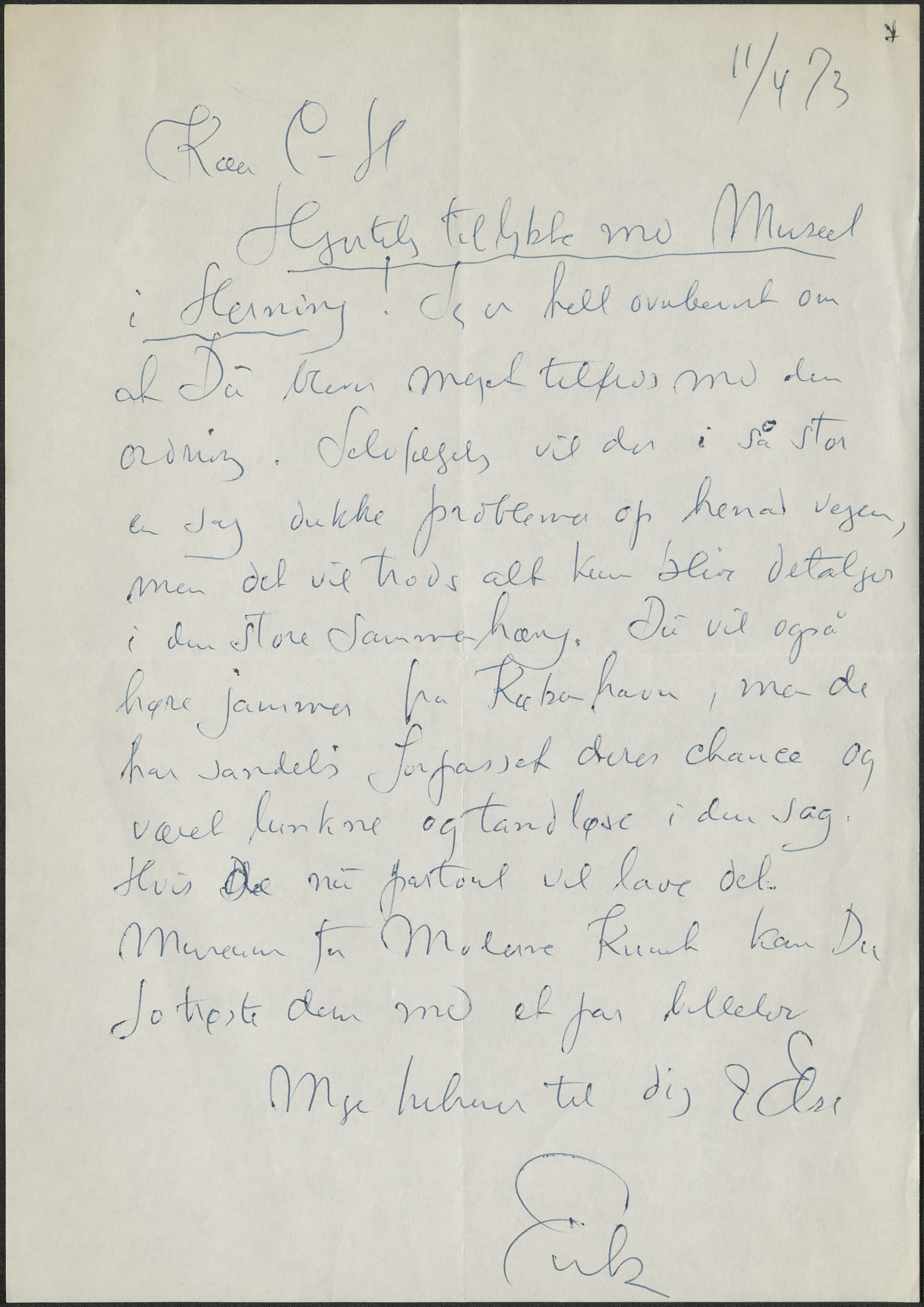Hjertelig til lykke med Museet i Herning! Jeg er helt overbevist om at Fu bliver meget tilfreds med den ordning. Selvfølgelig vil der i så stor en sag dukke problemer op hen ad vejen, men det vil trods alt kun blive detaljer i den store sammenhæng. Du vil også høre jamren fra København, men de har sandelig forpasset deres chance og været lunkne og tankeløse i den sag. Hvis De nu fortsat vil lave det Museum for Moderne Kunst kan Du jo høste dem med et par billeder.