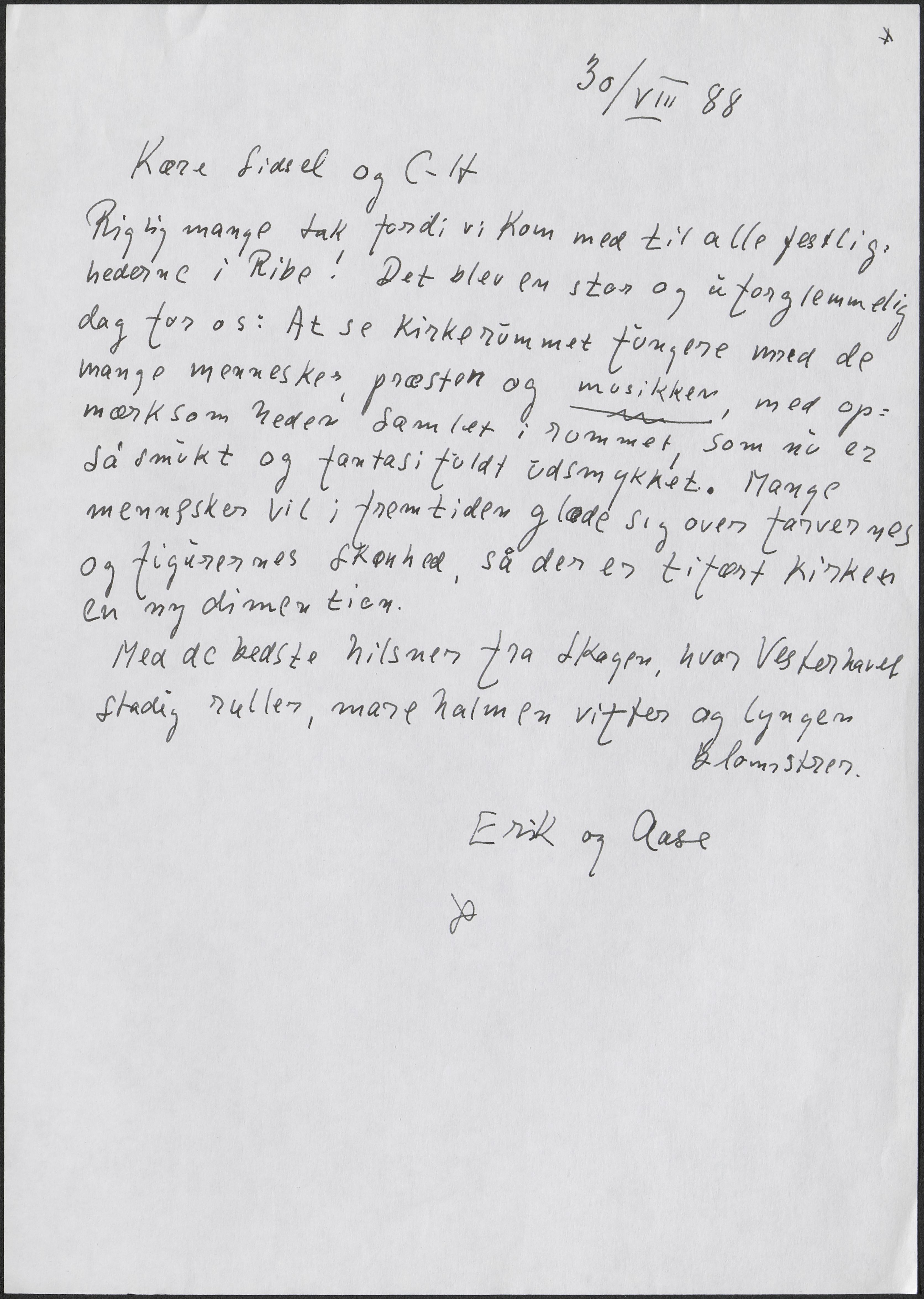 Erik Andreasen skriver til Carl-Henning Pedersen og Sidsel Ramson og takker for at måtte være med ved indvielsen af Carl-Henning Pedersens udsmykning af Ribe Domkirke.