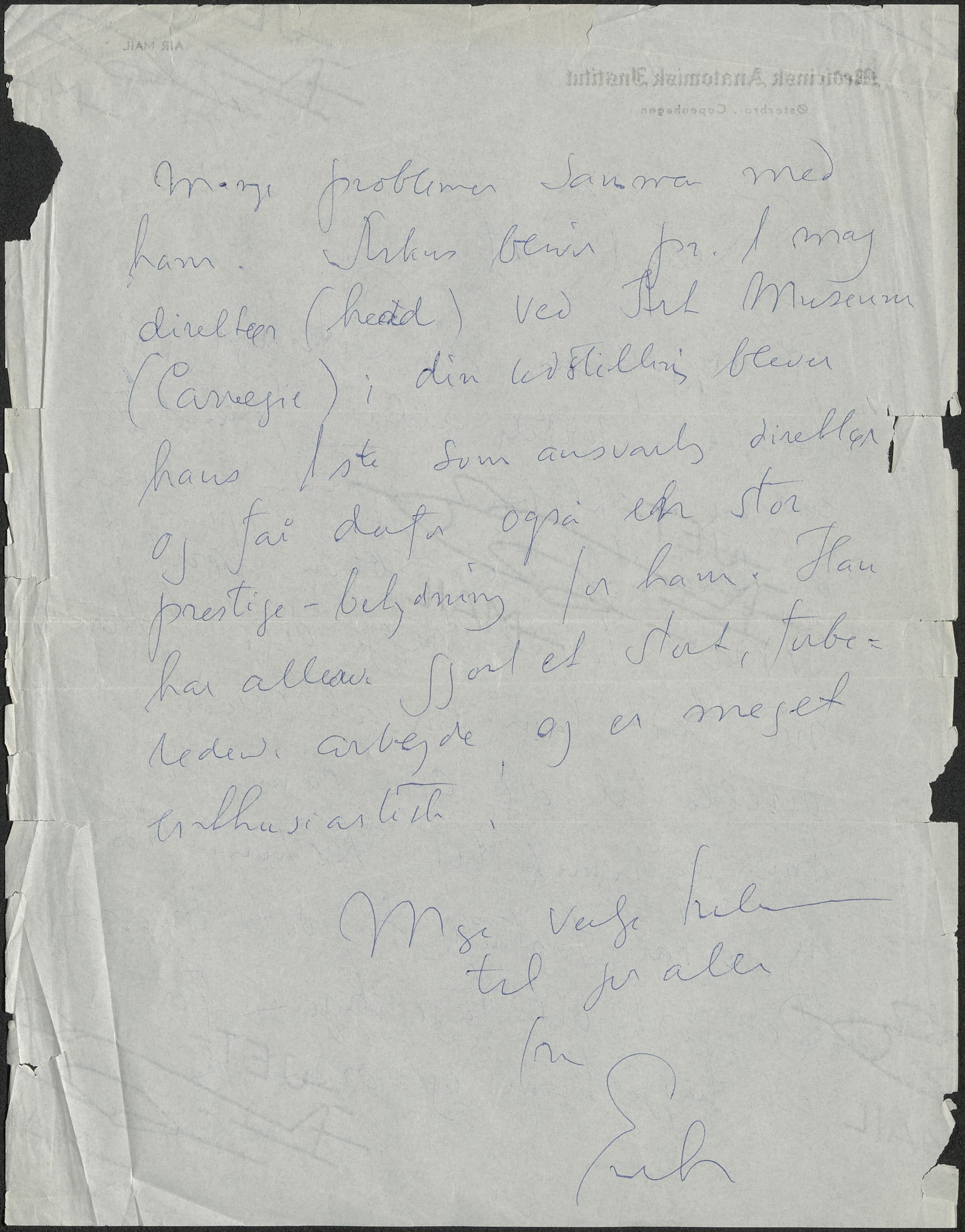 Korrespondancen Pittsburgh går livligt. Tiden er knap og Arkus tager til Kbhn. først i Maj for at træffe dig. Jeg har bedt ham om at skrive direkte til dig om dagen for hans ankomst til Kbhn., idet jeg jo har forstået fra dit brev at Du godt vil tage hjem for at træffe ham og ordne de mange pro-blemer sammen med ham. Arkus bliver fra 1. maj direktør (head) ved Museum (Carnegie) din ud-stilling bliver hans I.ste. som ansvarlig direktør og får derfor også en stor prestige-betydning for ham. Han har allerede gjort et stort, forberedende arbejde og er meget enthusiastisk.