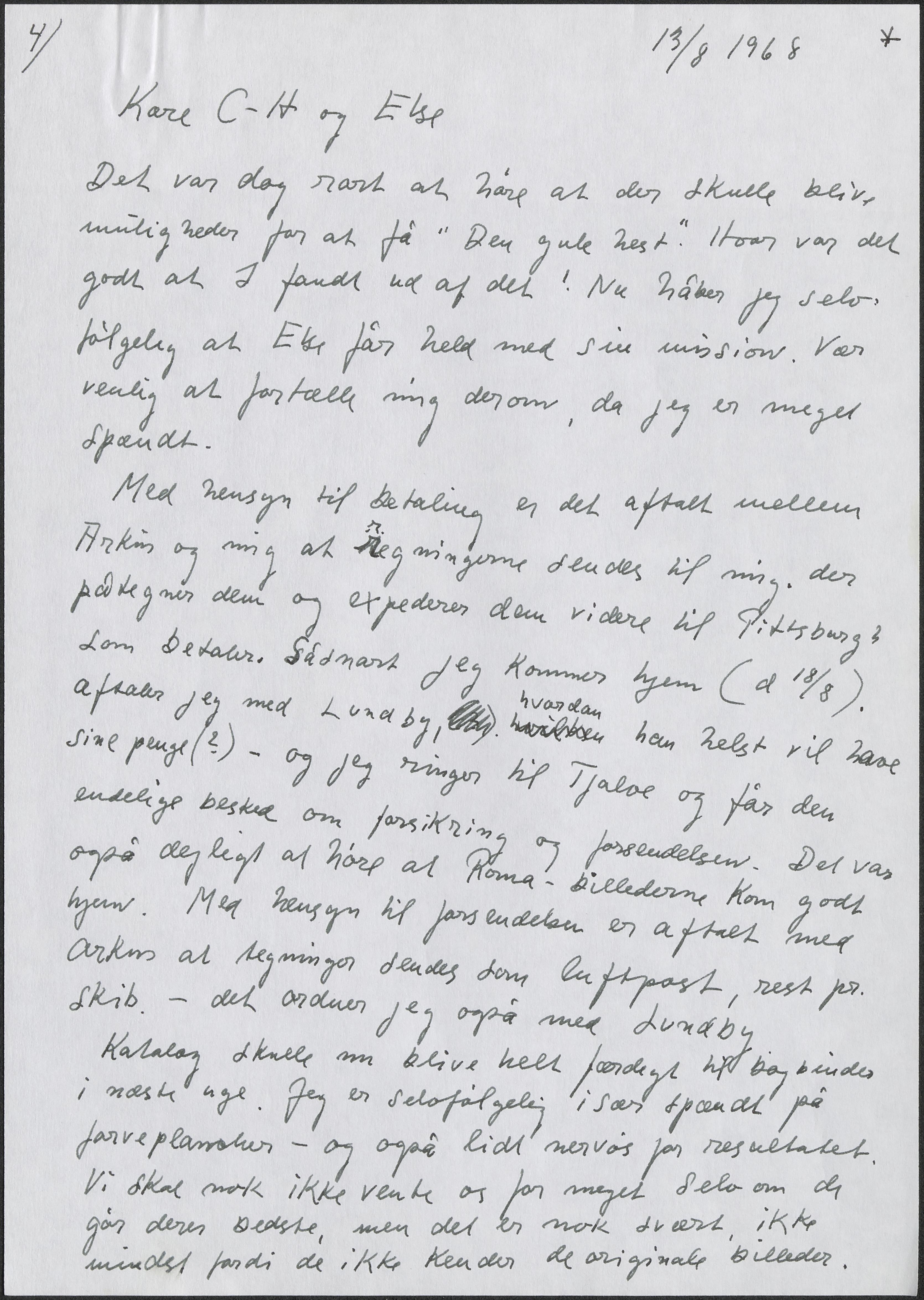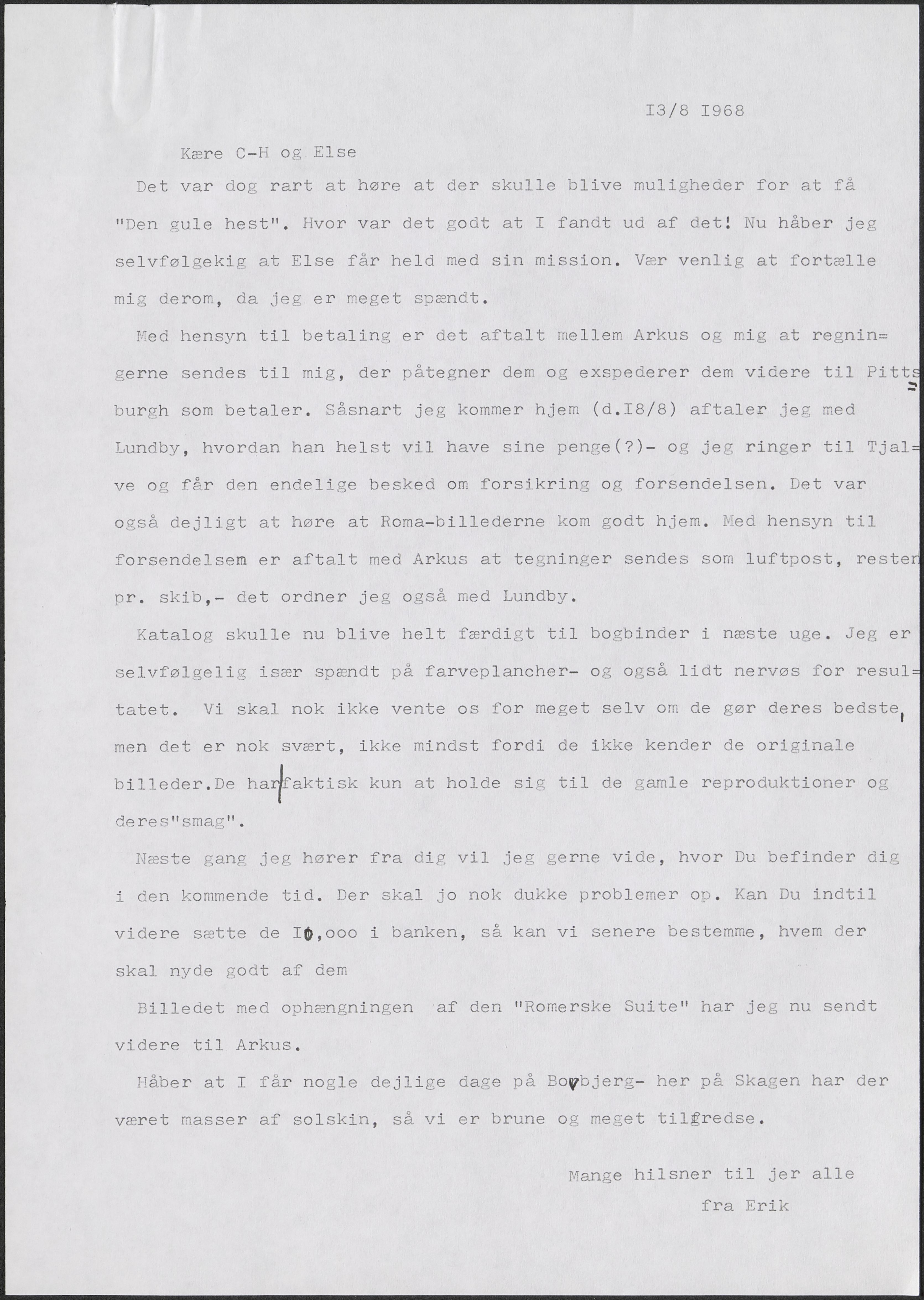 Med hensyn til betaling er det aftalt mellem Arkus og mig at regningerne sendes til mig, der på-tegner dem og expederer dem videre til Pittsburgh som betaler. Såsnart jeg kommer hjem (d.18/8) aftaler jeg med Lundby, hvordan han helst vil have sine penge (?) – og jeg ringer til Tjalve og får den endelige besked om forsikring og forsendelsen. Det var også dejligt at høre at Roma-billederne kom godt hjem. Med hensyn til forsendelsen er det aftalt med Arkus at tegninger sen-des som luftpost, resten pr. skib,. det ordner jeg også med Lundby.