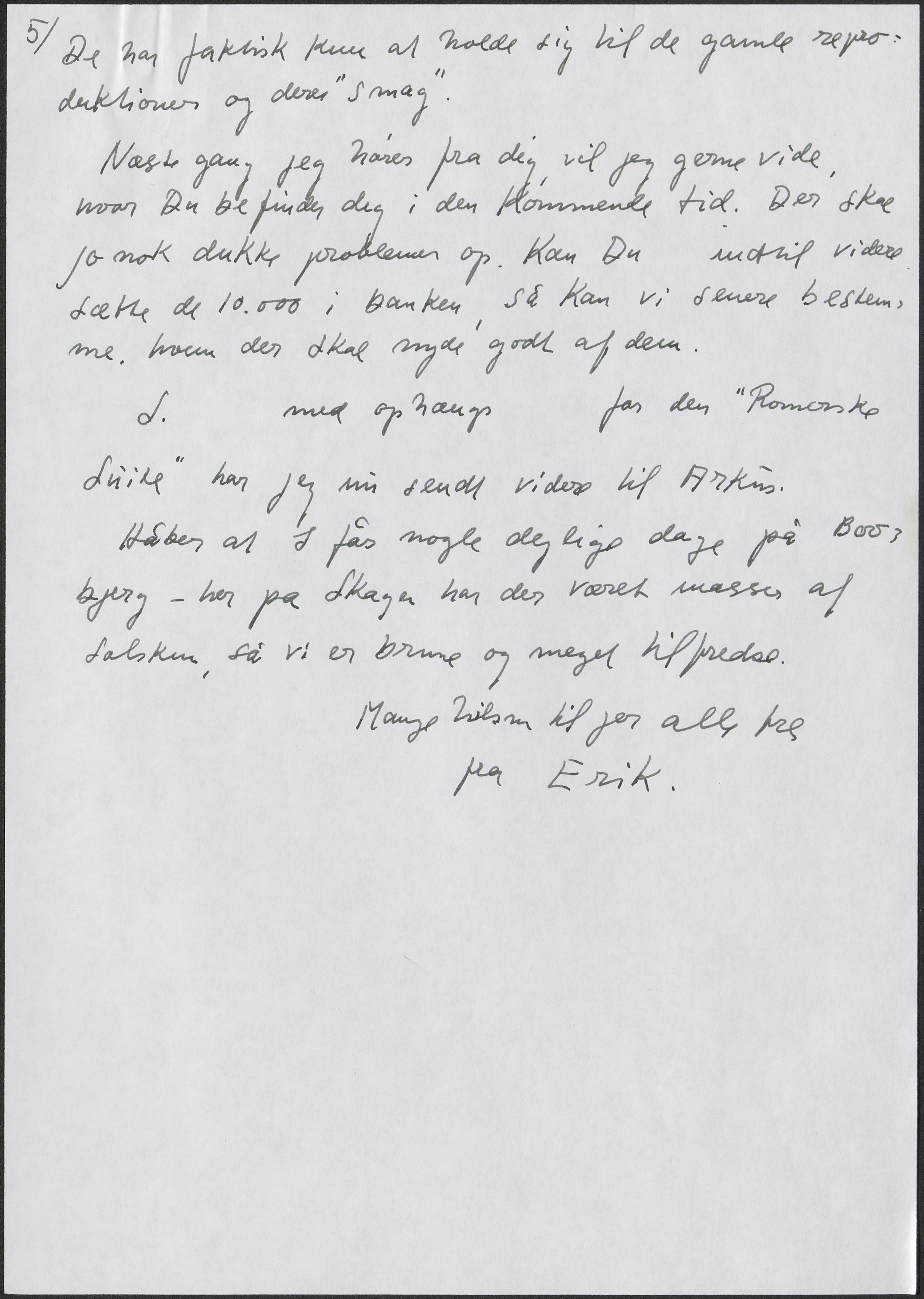 Næste gang jeg hører fra dig vil jeg gerne vide, hvor Du befinder dig i den kommende tid. Der skal jo nok dukke problemer op. Kan du indtil videre sætte de 10.000 i banken, så kan vi senere be-stemme, hvem der skal nyde godt af dem.