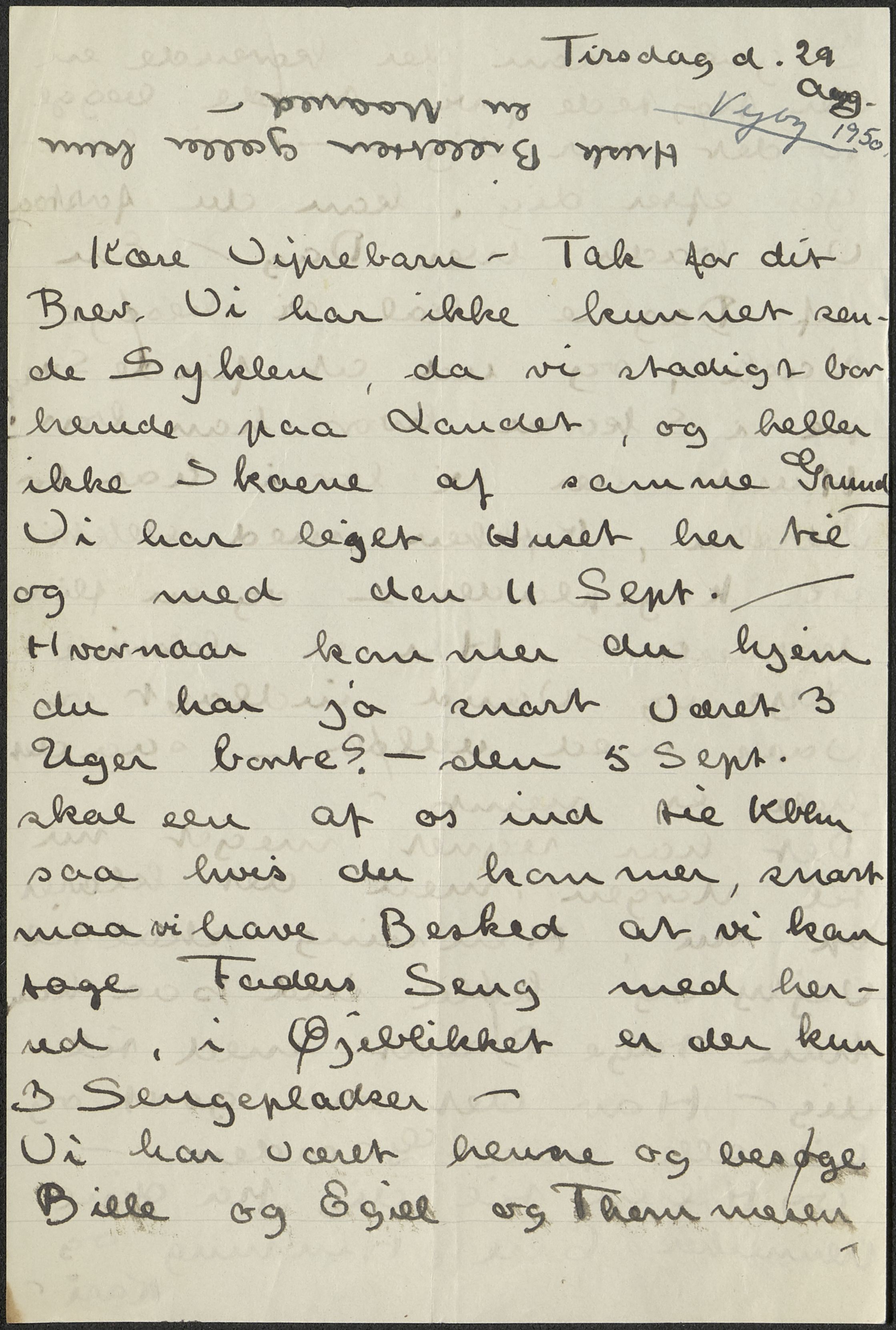 Du har jo snart været 3 Uger borte? – den 5 Sept. Skal én af os ind til Kbhn saa hvis du kommer, snart maa vi have Besked at vi kan tage Faders Seng med herud, i Øjeblikket er der kun 3 Senge-pladser –
