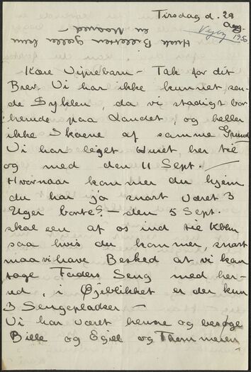 Kære Vipsebarn – Tak for dit Brev. Vi har ikke kunnet sende Syklen, da vi stadigt bor herude paa Landet, og heller ikke Skoene af samme Grund. Vi har lejet Huset har til og med den 11 Sept. /