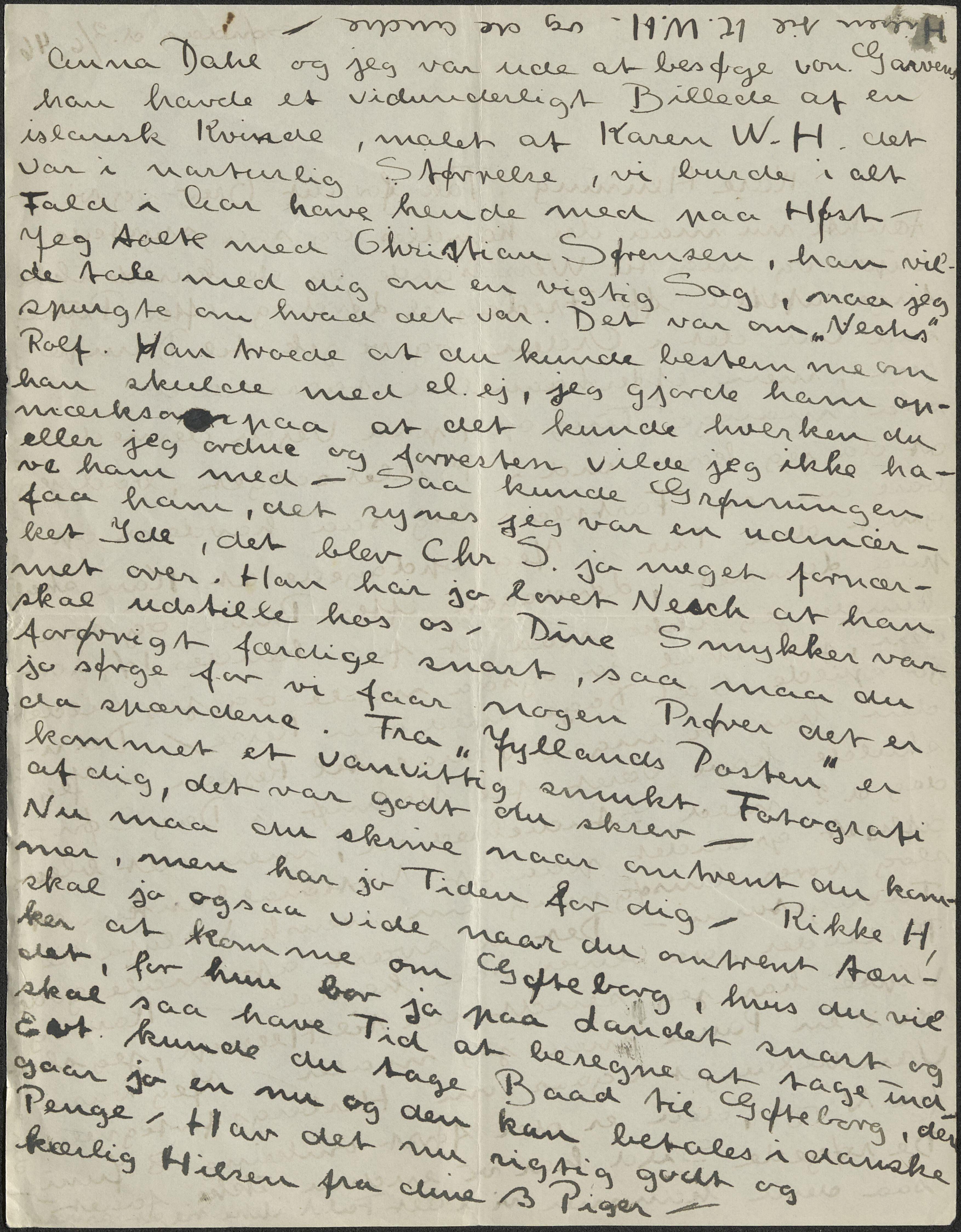 Anna Dahl og jeg var ude at besøge von Garvens han havde et vidunderligt Billede af en islansk Kvinde, malet af Karen W.H. det var i naturlig Størrelse, vi burde i alt Fald i Aar have hende med paa Høst – Jeg talte med Christian Sørensen, han vilde tale med dig om en vigtig Sag, naa jeg spurgte om hvad det var. Det var om ”Nechs” Rolf. Han troede at du kunde bestemme om han skulde med el. ej, jeg gjorde ham opmærksom paa at det kunde hverken du eller jeg ordne og for resten vilde jeg ikke have ham med / Saa kunde Grønningen faa ham, det synes jeg var en udmær-ket Ide, det blev Chr S. jo meget fornærmet over. Han har jo lovet Nesch at han skal udstille hos os/ Dine Smykker var for øvrigt færdige snart, saa maa du jo sørge for at vi faar nogen Prøver det er da spændende. Fra ”Jyllands Posten” er kommet et vanvittigt smukt Fotografi af dig, det var godt du skrev /