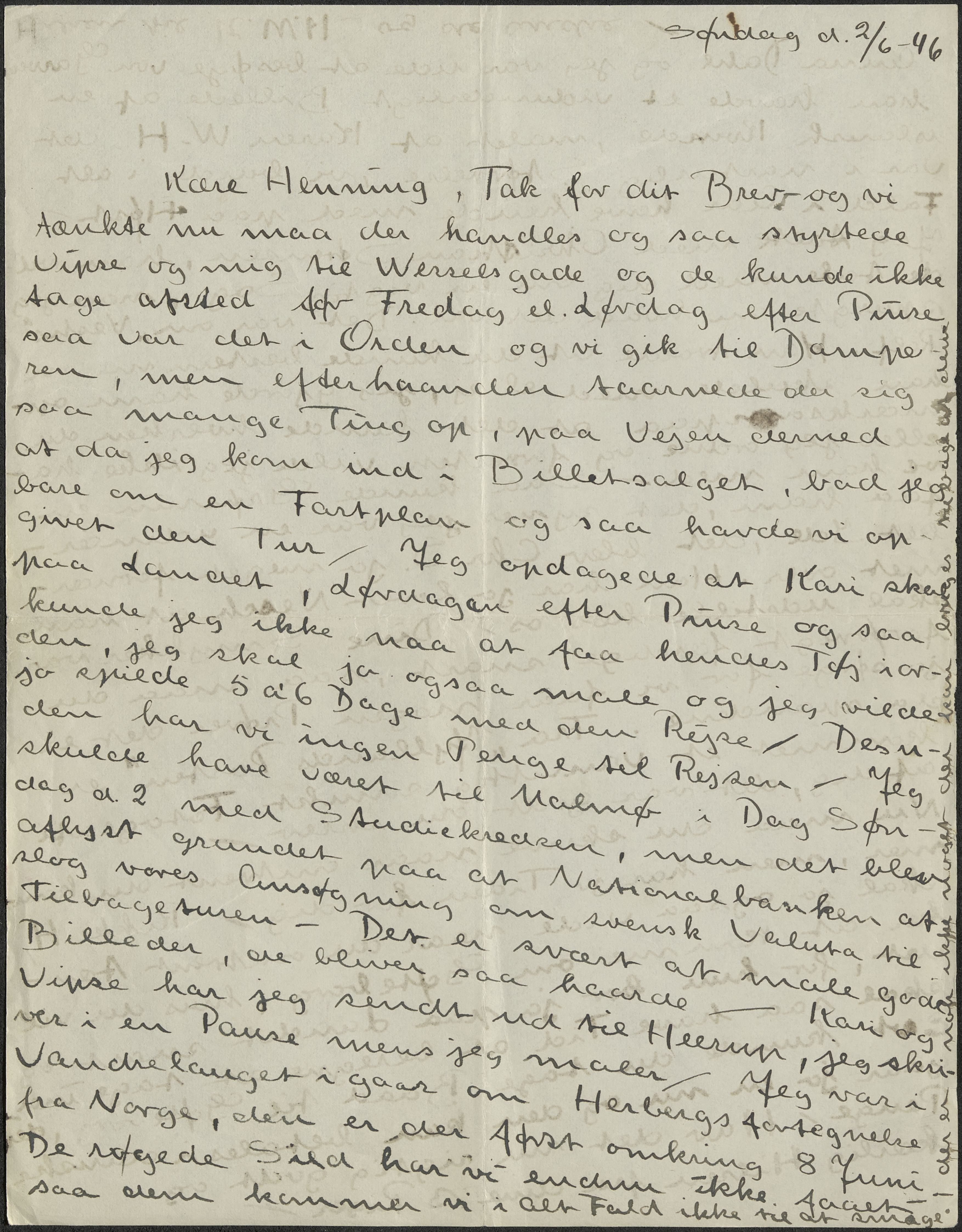 Kære Henning, Tak for dit Brev – og vi tænkte nu maa der handles og saa styrtede Vipse og mig til Wesselsgade og de kunde ikke tage af sted før Fredag el. Lørdag efter Pinse saa var det i Orden og vi gik til Damperen, men efterhaanden taarnede der sig saa mange Ting op, paa Vejen derned at da jeg kom ind i Billetsalget, bad jeg bare om en Fartplan og saa havde vi opgivet den Tur / Jeg opdagede at Kari skal paa Landet, Lørdagen efter Pinse og saa kunde jeg ikke naa at faa hendes Tøj i orden, jeg skal jo ogsaa male og vilde jo spilde 5 à 6 Dage med den Rejse / Desuden har vi ingen Penge til Rejsen / Jeg skulde have været til Malmø i Dag Søndag d. 2 med Studiekredsen, men det blev aflyst grundet paa at Nationalbanken afslog vores Ansøgning om svensk Valuta til Tilbage-turen – Det er svært at male gode Billeder, de bliver saa haarde / Kari og Vipse har jeg sendt ud til Heerup, jeg skriver i en Pause mens jeg maler / Jeg var i Vandrelauget i gaar om Herbergsforteg-nelse fra Norge, den er der først omkring 8 Juni. De røgede Sild har vi endnu ikke faaet saa dem kommer vi i alt Fald ikke til at smage. Der er nok ikke noget der kan bruges tilbage af dem. (Den sidst sætning står lodret i højre side af brevet).