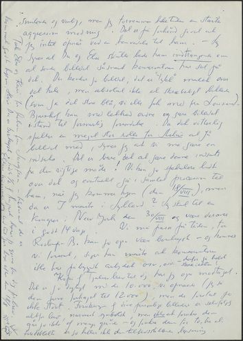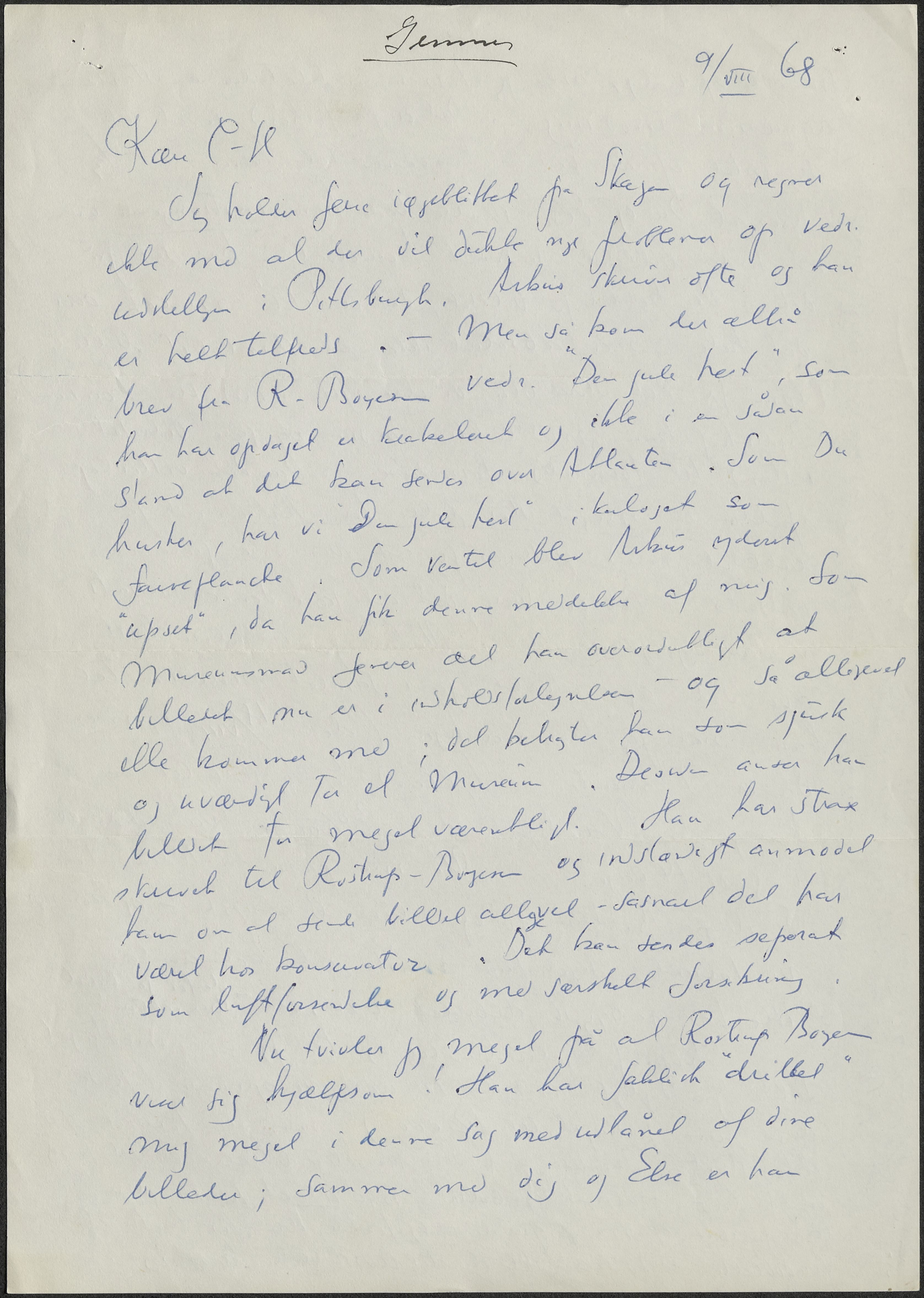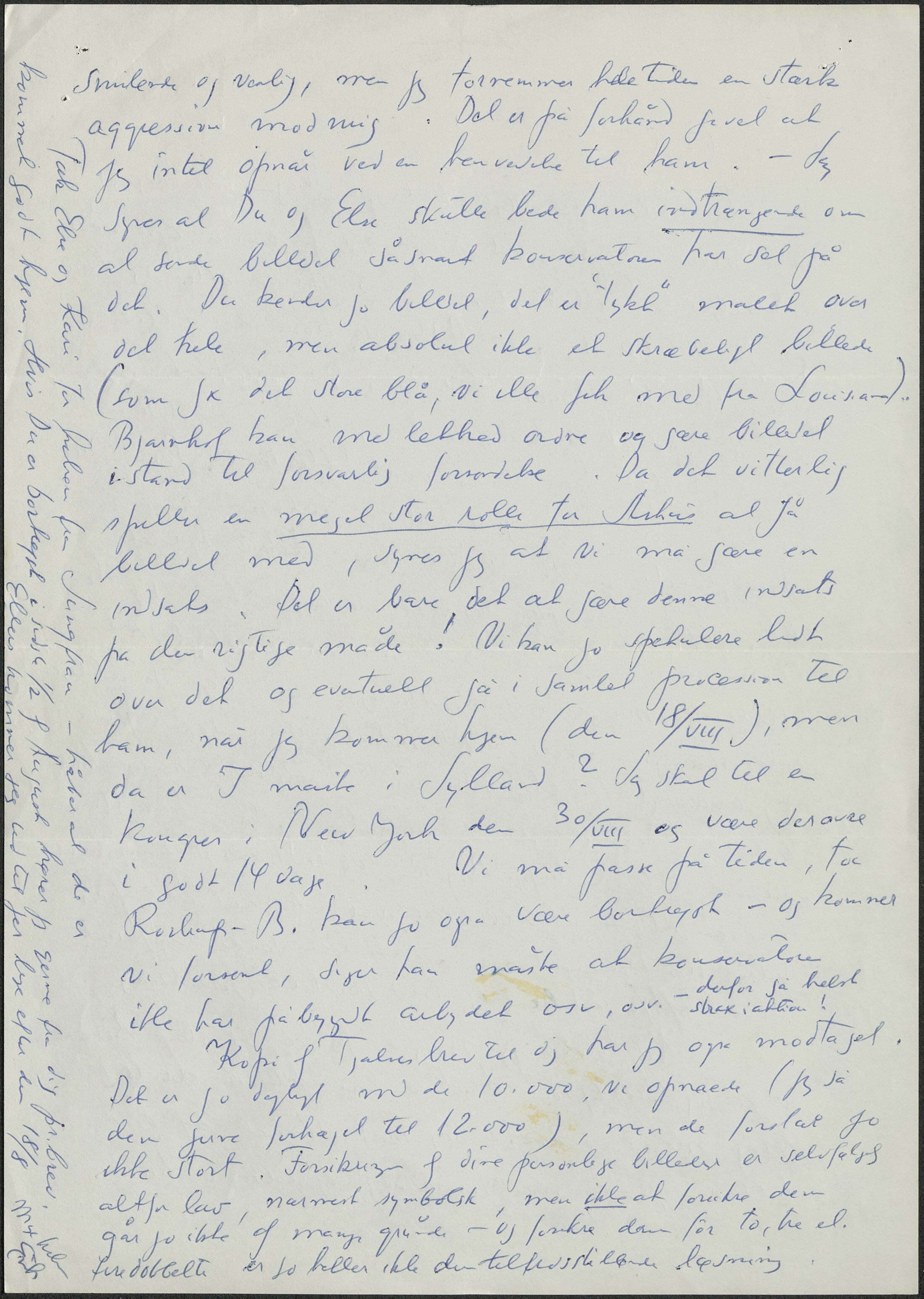 Nu tvivler jeg meget på at Rostrup-Boyesen viser sig hjælpsom. Han har faktisk ”drillet” mig meget i denne sag med udlånet af dine billeder; sammen med dig og Else er han smilende og venlig, men jeg fornemmer hele tiden stærk agression mod mig. Det er på forhånd givet at jeg intet opnår ved henvendelse til ham. Jeg syntes Du og Else skulle bede ham indtrængende om at sende billedet såsnart konservatoren har set på det. Du kender jo billedet, det er ”tykt” malet over det hele, men er absolut ikke et skrøbeligt billede (som fx det store blå, vi ikke fik med fra Louisiana).