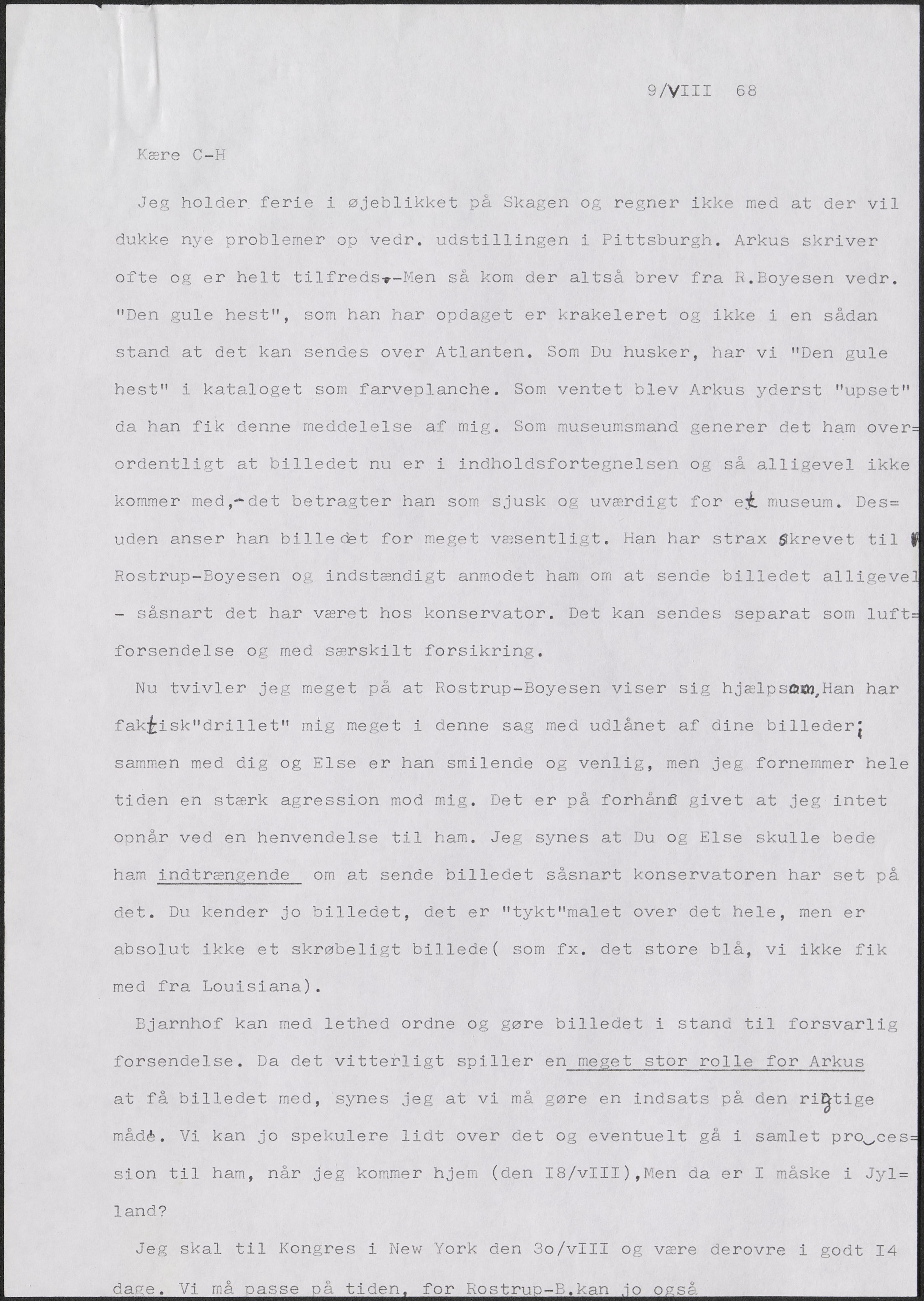 Jeg holder ferie i øjeblikket på Skagen og regner ikke med at der vil dukke nye problemer op vedr. udstillingen i Pittsburgh. Arkus skriver ofte og er helt tilfreds. Men så kom der altså brev fra R. Boyesen vedr. ”Den gule hest”, som han har opdaget er krakeleret og ikke i en sådan stand at det kan sendes over Atlanten. Som Du husker, har vi ”Den gule hest” i kataloget som farveplanche. Som ventet blev Arkus yderst ”upset” da han fik denne meddelelse fra mig. Som museumsmand generer det ham overordentligt at billedet nu er i indholdsfortegnelsen og så alligevel ikke kom-mer med, - det betragter han som sjusk og uværdigt for et museum. Desuden anser han billedet for meget væsentligt. Han har strax skrevet til Rostrup-Boyesen og indstændigt anmodet ham om at sende billedet alligevel – såsnart det har været hos konservator. Det kan sendes separat som luftforsendelse og med særskilt forsikring.
