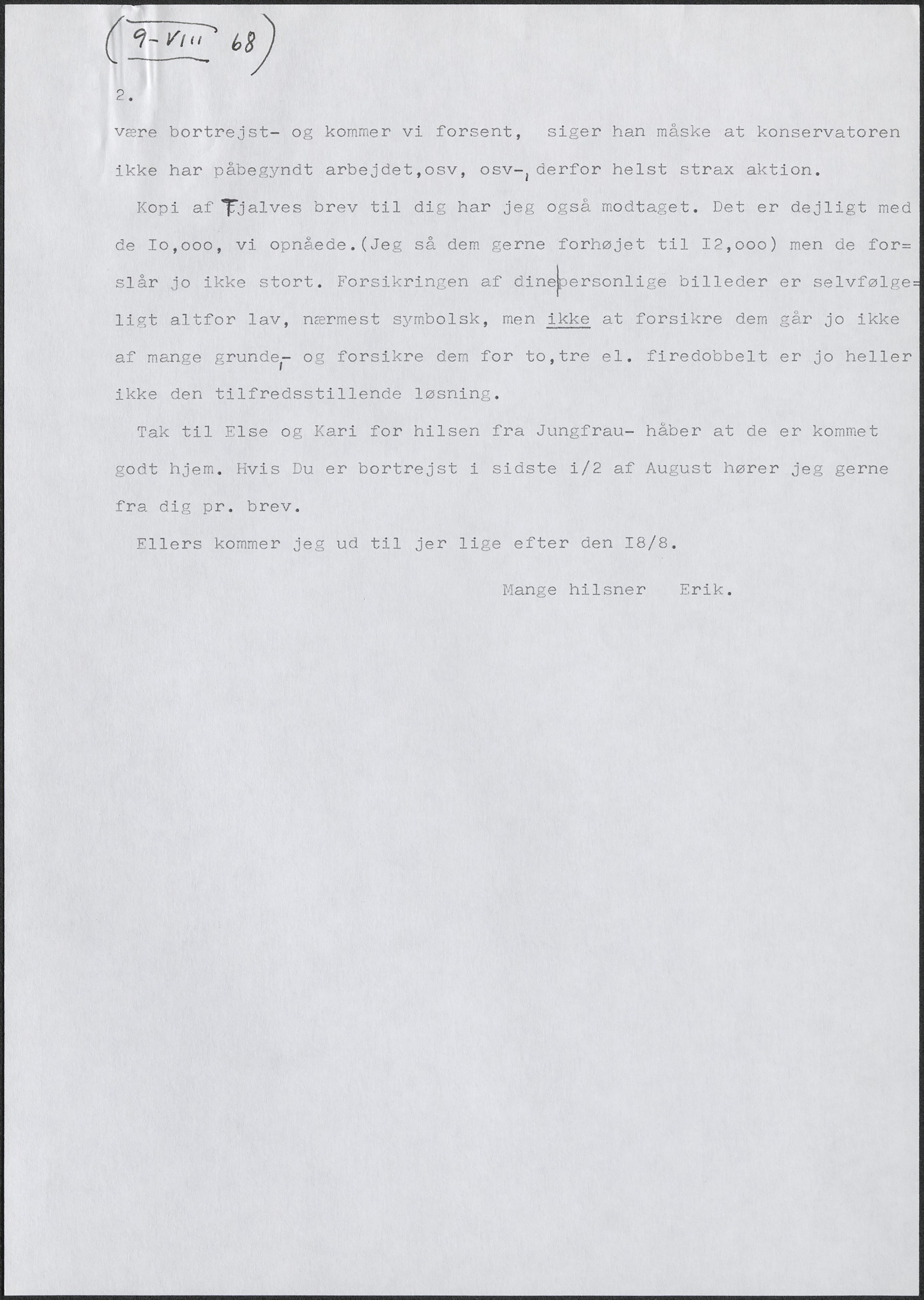 Kopi af Tjalves brev til dig har jeg også modtaget. Det er dejligt med de 10.000, vi opnåede. (Jeg så dem gerne forhøjet til 12.000) men de forslår jo ikke stort. Forsikringen af dine personlige billeder er selvfølgeligt alt for lav, nærmest symbolsk, men ikke at forsikre dem går jo ikke at mange grun-de,- og forsikre dem for to, tre el. firdobbelt er jo heller ikke den tilfredsstillende løsning.