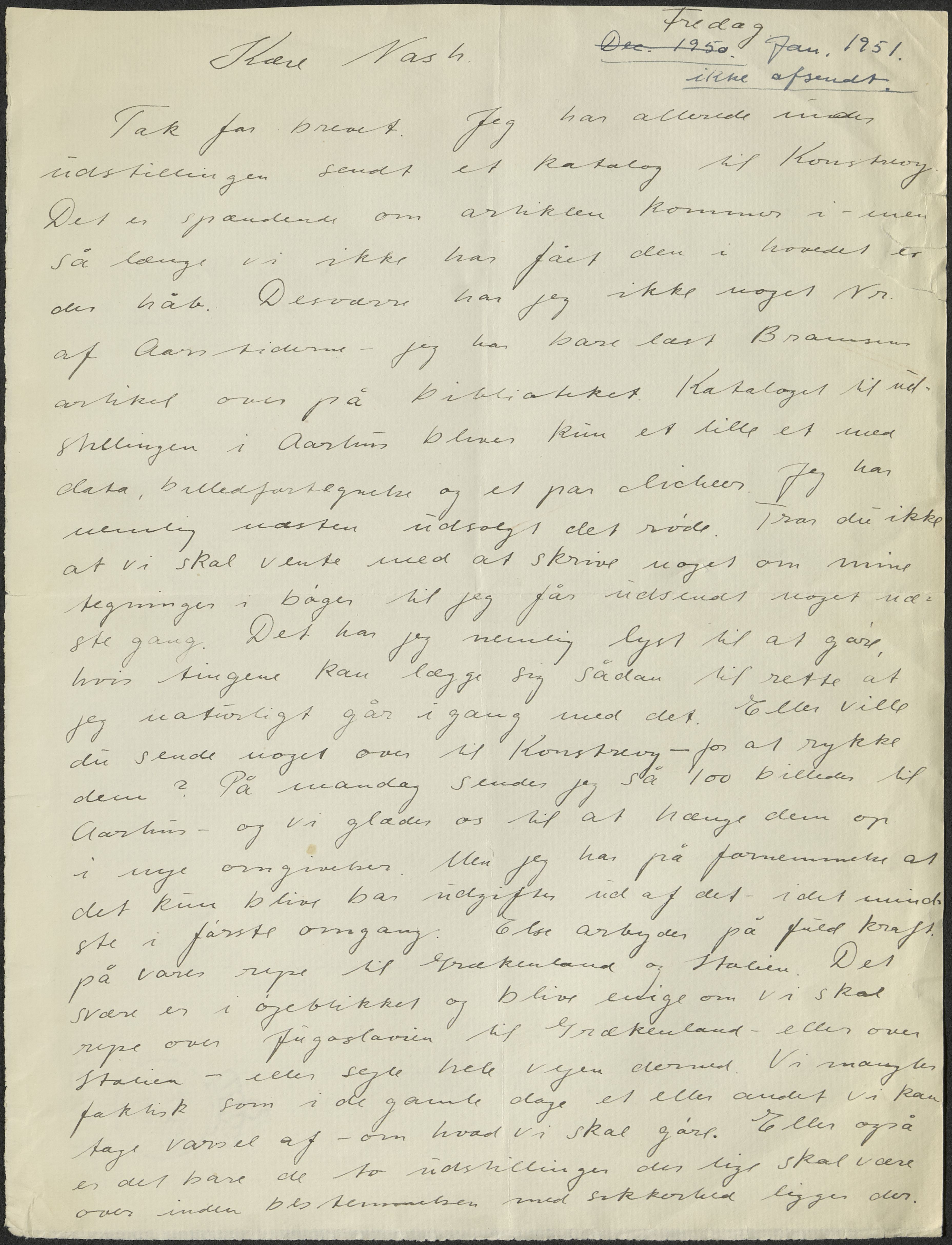 Tak for brevet. Jeg har allerede under udstillingen sendt et katalog til Konstrevy. Det er spændende om artiklen kommer i – men så længe vi ikke har fået den i hovedet er der håb. Desværre har jeg ikke noget Nr. til Aarstiderne – jeg har bare læst Bramsens artikel over på biblioteket. Ka-taloget til udstillingen i Aarhus bliver kun et lille et med data, billedefortegnelse og et par clicheer. Jeg har nemlig næsten udsøgt det røde. Tror du ikke at vi skal vente med at skrive noget om mine tegninger i bøger til jeg får udsendt noget næste gang. Det har jeg nemlig lyst til at gøre, hvis tingene kan lægge sig sådan til rette at jeg naturligt går i gang med det. Eller ville du sende noget over til Konstrevy – for at rykke dem? På mandag sender jeg så 100 billeder til Aarhus – og vi glæ-der os til at hænge dem op i nye omgivelser. Men jeg har på fornemmelse at det kun bliver bar udgifter ud af det – i det mindste i første omgang. Else arbejder på fuld kraft på vores rejse til Grækenland og Italien. Det svære er i øjeblikket og blive enige om vi skal rejse over Jugoslavien til Grækenland – ellers over Italien – eller sejle hele vejen derned. Vi mangler faktisk som i de gamle dage et eller andet vi kan tage varsel af – om hvad vi skal gøre. Eller også er det bare de to udstillinger der lige skal være over inden bestemmelsen med sikkerhed ligger der