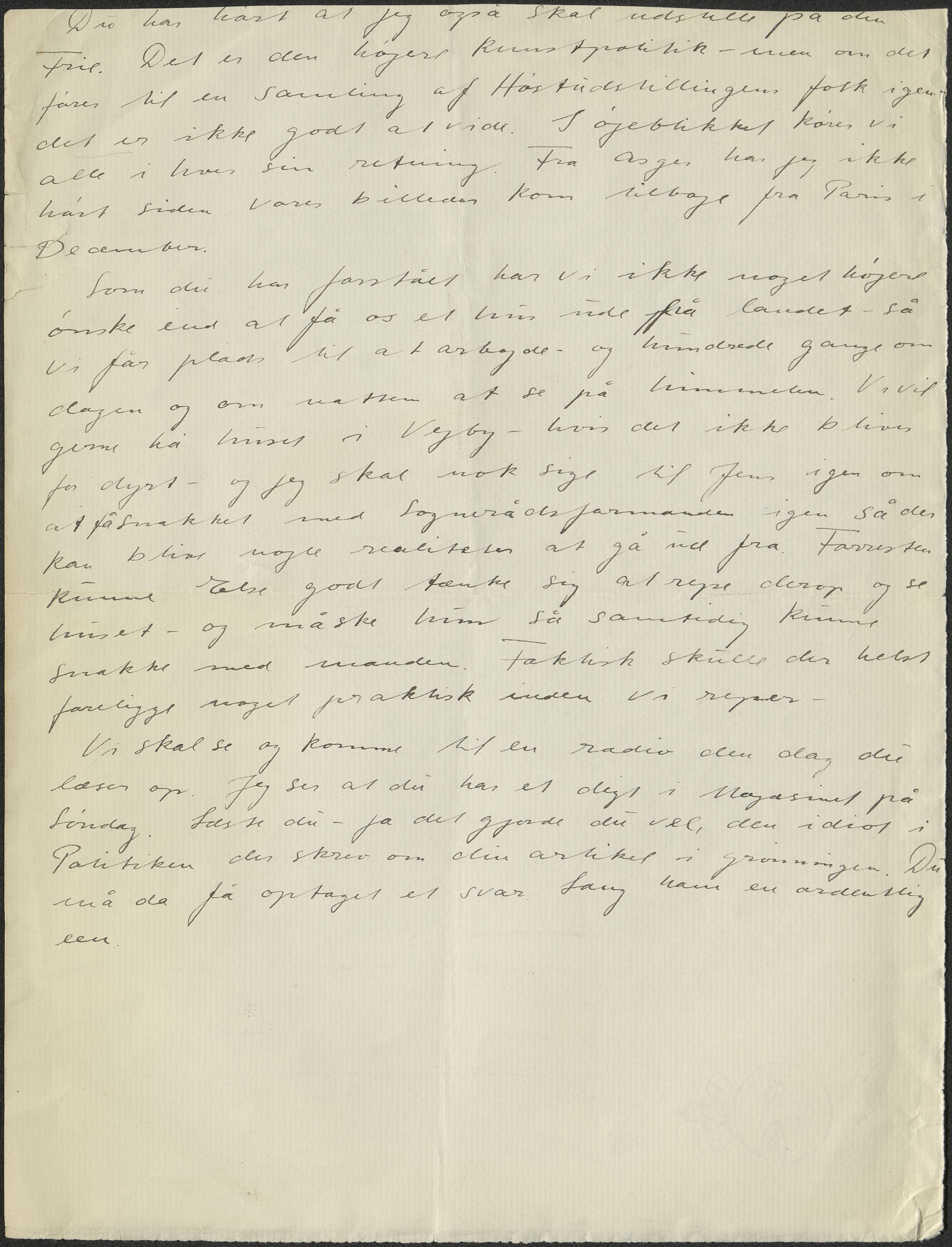 Du har hørt at jeg også skal udstille på den Frie. Det er den højere kunstpolitik – men om det fører til en samling af Høstudstillingens folk igen- det er ikke godt at vide. I øjeblikket kører vi alle i hver sin retning. Fra Asger har jeg ikke hørt siden vores billeder kom tilbage fra Paris i December.