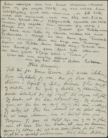 Vi har faaet Brev fra vores Unge, Vips, hun befinder sig storartet, hun sover i en hvidmalet Seng inde hos Manden og Konen, de tror vist det er deres Barn / de har fem Heste paa Gaarden saa det er noget for hende / Traf i Dag Sjølander, du ved maleren som Rikke talte om, han kommer til Kø-benhavn snart og køber sikkert nogen af mine Oliekridttegninger – Dupont Nielsen var lige inden jeg rejste hos os. Det med Billedet gik i Orden han vil gerne give 400 Kr for det, jeg lavede en Histo-rie om at det var Marinus der havde købt det men at jeg regnede med at kunde overtale ham, til at give Afkald paa det – han spurgte saa om hvad Marinus skulde give og jeg sagde 400 Kr og saa vilde han selvfølgelig give det samme, vi fik 50 Kr med det samme, saa nu bliver det 210 Kr vi har faaet der / Høymark sendte de 100 Kr inden jeg rejste. Nu sender jeg dette i Haab om at du faar Brevet for Rikke maa jo have din Adr. og sende videre til sine Bekendte i Norge at du kan faa For-stærkning. Maaske kan du tage over Sverige hjem at Rikke kan træffe dig. Send den saa hurtigt du faar fast Adr ellers eén der kan gælde 8 Dage frem i Tiden. /