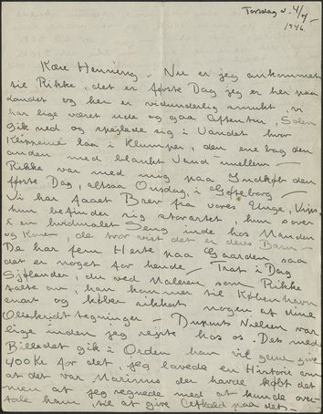 Kære Henning, Nu er jeg ankommet til Rikke, det er første Dag jeg er her paa Landet og her er vid-underlig smukt, vi har lige været ude og gaa Aftentur, Solen gik ned og spejlede sig i Vandet hvor Klipperne laa i Klumper, den ene bag den anden med blankt Vand imellem / Rikke var med mig paa Indkøb den første Dag, altsaa Onsdag i Gøteborg /