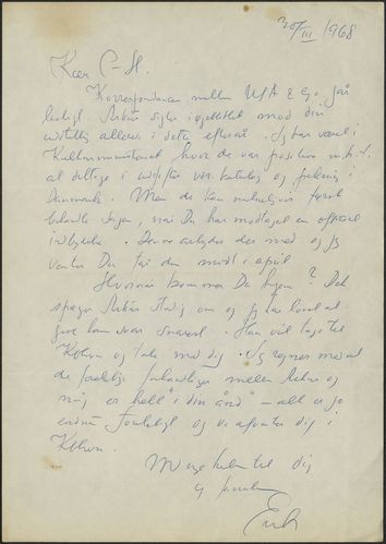 Hvornår kommer Du hjem? Det spørger Arkus stadig om og jeg har lovet at give han svar snarest. Han vil tage til Kbhn. og tale med dig. Jeg regner med at de foreløbige forhandlinger mellem Arkus og mig er helt ”i din ånd” – alt er jo endnu foreløbigt og vi afventer dig i Kbhn.