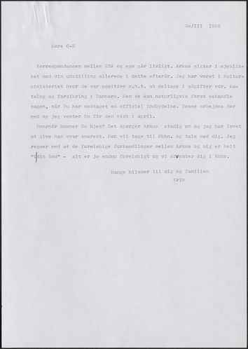 Korrespondancen mellem USA og ego går livligt. Arkus sigter i øjeblikket mod din udstilling allere-de i dette efterår. Jeg har været i Kulturministeriet hvor de var positive m.h.t. at deltage i udgifter vdr. Katalog og forsikring i Danmark. Men de kan naturligvis først behandle sagen, når Du har modtaget en officiel indbydelse. Denne arbejdes der med og jeg venter Du får den midt i april.