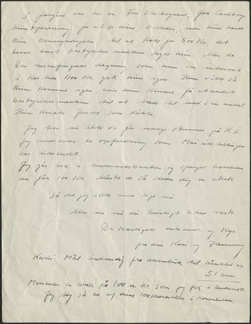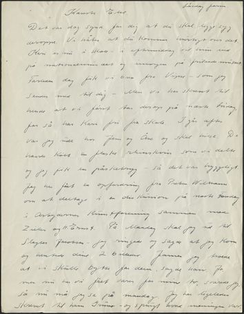 Det var dog synd for dig at du skal ligge syg deroppe. Vi håber at du kommer hurtigt over det. Kari er nu i skole – i eftermiddag vil hun ind på nationalmuseet og i morgen på frilandsmuseet. Forle-den dag fik vi brev fra Vipse – som jeg sender med til dig – Men vi har skrevet til hende at vi først tar derop på næste lørdag, for så har Kari fri fra skole. I går aftes var jeg ude hos Hans og Åse og skal hilse. De havde købt en flaske [kan ikke læses]vin som vi delte og jeg fik en påskebryg – så det var hyggeligt. Jeg har fået en opfordring fra Preben Wilmann om at deltage i en diskussion på næ-ste torsdag i arbejdernes Kunstforening sammen med Zieler og H. [kan ikke læses]. På mandag skal jeg ud til slagter Jacobsen – jeg ringede og sagde at jeg kom og hentede dine 2 billeder. Jamen jeg troede at vi skulle bytte for dem, sagde han. Jo, men nu har vi fået varer for mine to svarede jeg, så nu må jeg se på mandag. Jeg har ligeledes skrevet til ham [kan ikke læses] – og spurgt hvad me-ningen var.