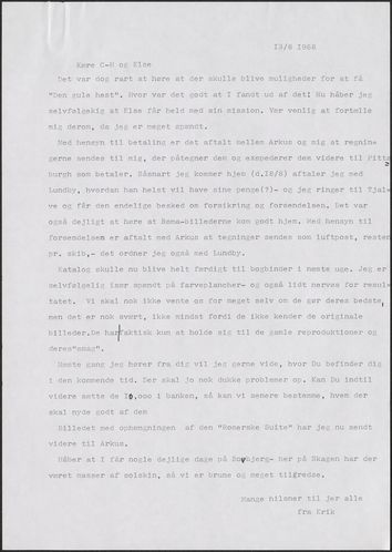 Med hensyn til betaling er det aftalt mellem Arkus og mig at regningerne sendes til mig, der på-tegner dem og expederer dem videre til Pittsburgh som betaler. Såsnart jeg kommer hjem (d.18/8) aftaler jeg med Lundby, hvordan han helst vil have sine penge (?) – og jeg ringer til Tjalve og får den endelige besked om forsikring og forsendelsen. Det var også dejligt at høre at Roma-billederne kom godt hjem. Med hensyn til forsendelsen er det aftalt med Arkus at tegninger sen-des som luftpost, resten pr. skib,. det ordner jeg også med Lundby.