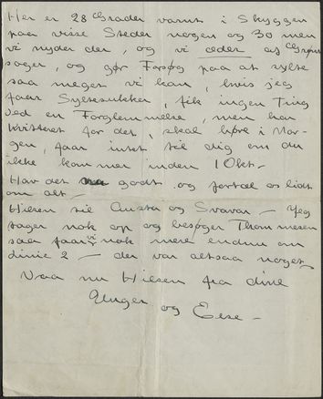 Her er 28 Grader varmt i Skyggen paa visse Steder nogen og 30 men vi nyder det, og vi æder af Grøntsager, og gør Forsøg paa at sylte saa meget vi kan, hvis jeg faar Syltesukker, fik ingen Ting ved en Forglemmelse, men har Kvitteret for det, skal høre i Morgen, faar intet til dig om du ikke kommer inden 1 Okt/