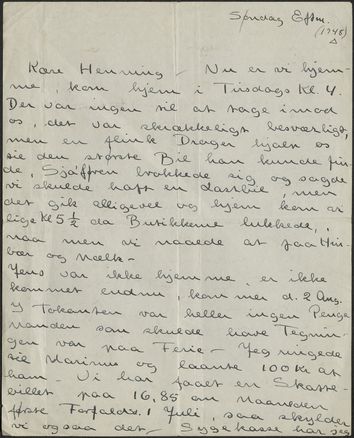 Kære Henning / Nu er vi hjemme, kom hjem i Tirsdags Kl. 4. Der var ingen til at tage imod os, det var skrækkeligt besværligt, men en flink Drager hjalp os til den største Bil han kunde finde, Sja´føren brokkede sig og sagde vi skulde haft en lastbil, men det gik alligevel og hjem kom vi lige Kl. 5½ da Butikkerne lukkede, naa men vi naaede at faa Hinbær og Mælk –
