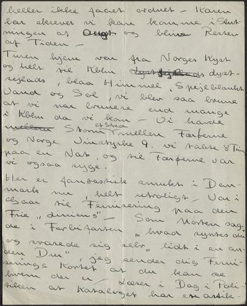 Turen hjem var fra Norges Kyst og helt til Kbhn Lystsejlads, blaa Himmel, Spejlblankt Vand og Sol, vi blev saa brune at vi var brunere end mange i Kbhn da vi kom – vi havde Storm et sted mellem Færøerne og Norge Vindstyrke 9, vi tabte 8 Timer paa en Nat, og til Færøerne var vi ogsaa syge.