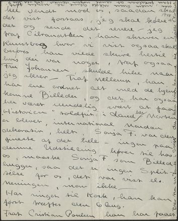 Her er fantastisk smukt i Danmark nu, helt utroligt / Var i Gaar til Fernisering paa den Frie ”Lini-ens” / Som Morten sagde i Forbifarten ”hvad syntes du og svarede sig selv” lidt i en anden Dur”, jeg sender dig Ferniserings Kortet at du kan se hvem der er / Læser i Dag i Politiken at Kataloget har en artikel vendt mod os, saadan skal det vist forstaas, jeg skal købe det og sende det senere / jeg traf Cibrandtzen, han skriver en Kunstbog hvor vi vist ogsaa skal berøres, han vilde skrive hertil hvis der var noget, traf ogsaa Fru Johansen, skulde hilse når jeg skrev / Traf Mellerup, han har ene ordnet alt med de hjemkomne Billeder, og det har ogsaa her været uendelig svært at faa ”Histori-en ”toldfrit i Land her /Morten er blevet, international Mondæn dekorativ, helt, Sonja F. var den fineste af det hele – ingen paa denne Udstilling hører til hos os, maaske Sonja F som Billedhugger, saa det er ingen splittelse for os, det var vist els. meningen, mon ikke /