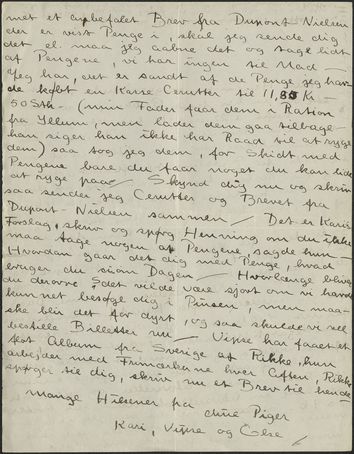 Kære Henning, vi gaar og venter paa at høre om du har faaet Pakken, vi sendte den herfra d. 22 ds. – Vi har det godt alle tre / Von Garvens var her i Fredags, han fik din Akvarel og han købte en af mig til 75 Kr til Betaling til Eft.aaret, samme Dag var Rosberg her, for at høre om du vilde komme til Møde, han købte en Akvarel af dig, den kostede 50 Kr saa sagde jeg at mellem Malere o.s.v. og lod ham faa den for 35 Kr dem fik jeg og har jeg brugt, jeg maatte købe Farver og Sokker til Vipse og de Penge til Skoene til Ungerne har jeg ogsaa brugt / Naa videre, sammen Dag fik jeg medelelse fra Kunstforeningen om Legatet 400 kr som jeg vil faa tilsendt paa Legatstifterindens Fødselsdag d. 31 Juli / Jeg er vældig igang med at male, men har ikke faaet lavet det rigtige endnu – jeg laver mange Akvareller og vilde gerne have en Akvarelblok men den koster 8 a 9 Kr. der er vist nej det ved jeg ikke hvor mange Blade der er i / Jeg ved ikke hvordan jeg skal forholde mig, der er kommet et anbefalet Brev fra Dupont-Nielsen der er vist Penge i, skal jeg sende dig det el maa jeg aabne det og tage lidt af Pengene, vi har ingen til Mad / Jeg har, det er sandt af de Penge jeg har købt en Kasse Cerutter til 11,85 Kr – 50 Stk – (min Fader faar dem i Ration fra Illum, men lader dem gaa til-bage – han siger han ikke har raad til at ryge dem) saa jeg tog dem, for Skidt med Pengene bare du faar noget du kan lide at ryge paa / Skynd dig nu og skriv saa jeg sender Cerutter og Brevet fra Du-pont-Nielsen sammen / Det er Kari´s Forslag, skriv og spørg Henning om du ikke kan tage nogen af Pengene, sagde hun - Hvordan gaar det dig med Penge, hvad bruger du ci. om Dagen / Hvorlænge bliver du derovre? Det vilde være sjovt om vi havde kunnet besøge dig i Pinsen, men maaske blir det for dyrt, og saa skulde vi vel bestille Billetter nu / Vipse har faaet et flot Album fra Sverige af Rikke, hun arbejder med Frimærkerne hver Aften, Rikke spørger til dig, skriv nu et Brev til hende